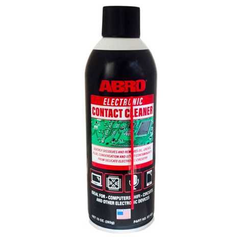 El Limpiador de Contactos Electrónicos ABRO en aerosol es perfecto para limpiar componentes eléctricos y electrónicos. Su fórmula elimina la condensación, humedad, aceite, grasa y suciedad de tableros de circuitos, contactos eléctricos, interruptores, enchufes e instrumentos de precisión.