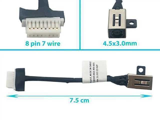 Este puerto de carga (DC Jack) es compatible con el modelo Dell Inspiron 7706, identificado como P98F. Incluye un cable de aproximadamente 7.5 cm y cuenta con 8 pines en 7 hilos. El conector tiene un diámetro externo de 4.5 mm y un diámetro interno de 3.0 mm.